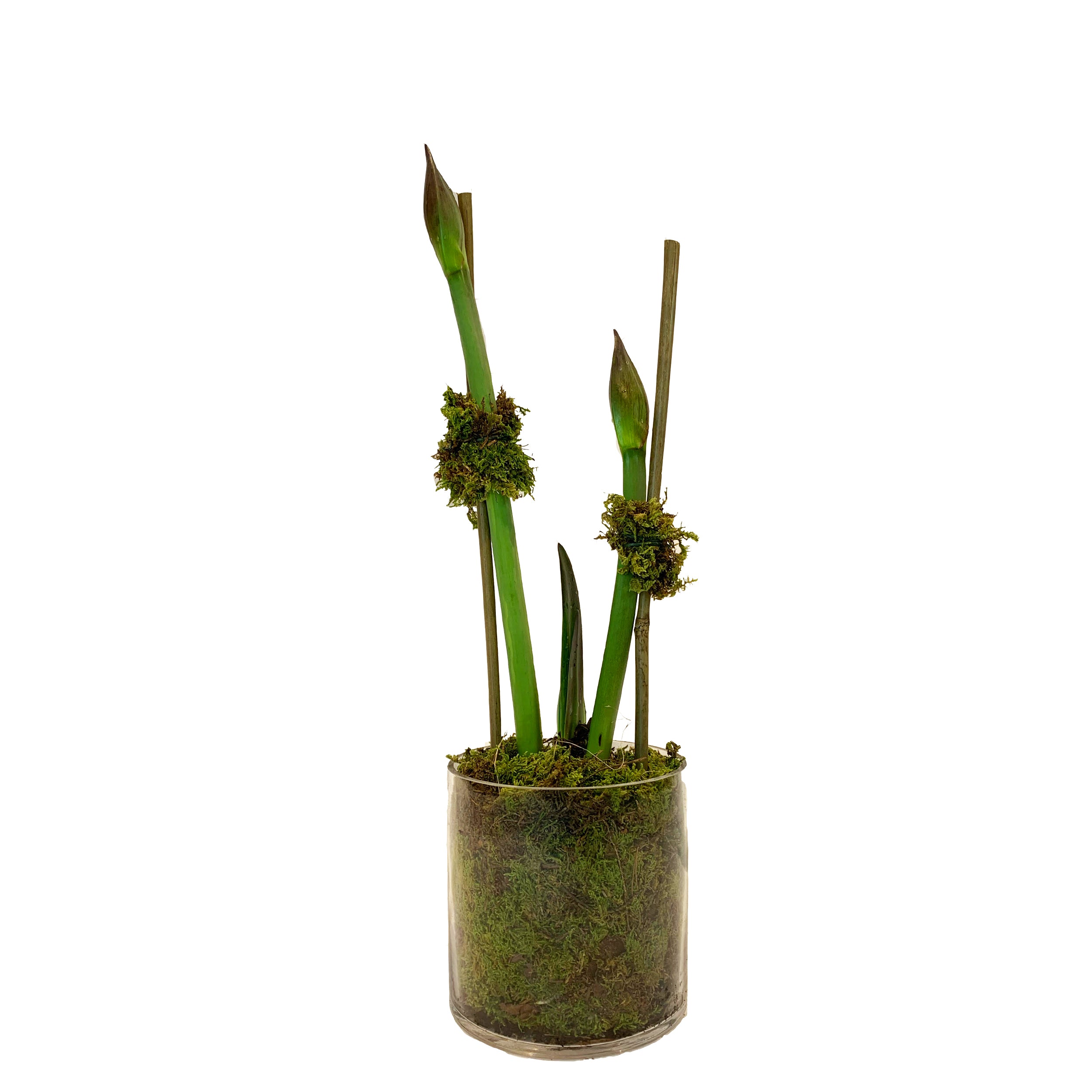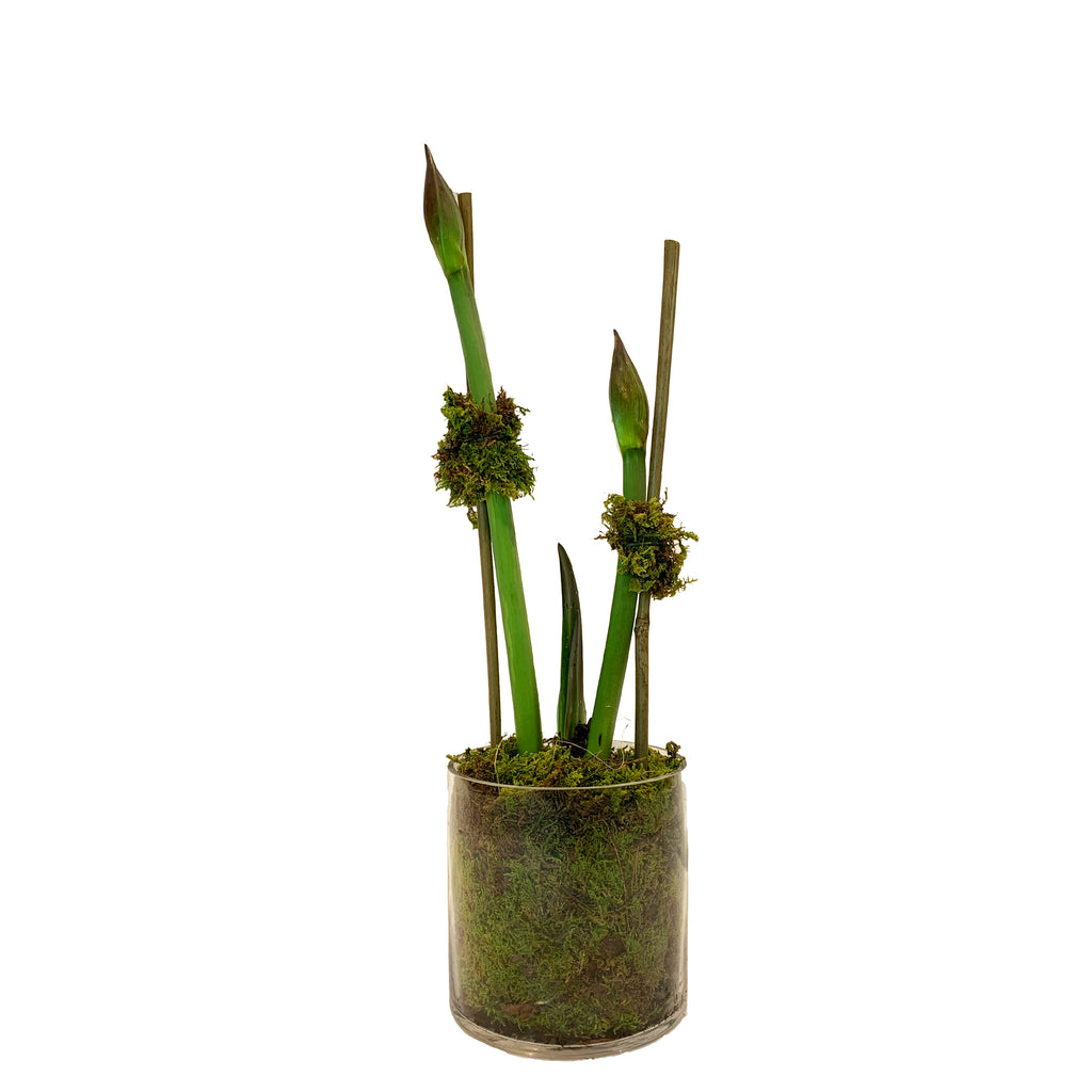 A seasonal Amaryllis planted with moss or modern rock accents in a modern planter.