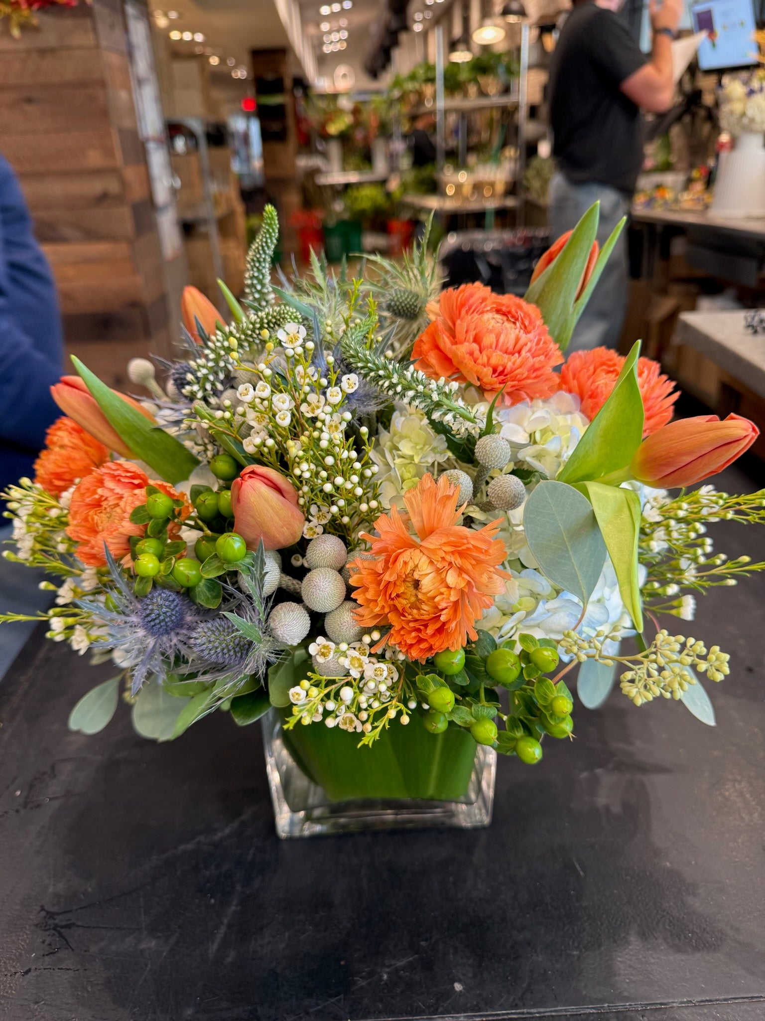 A lush garden style flower arrangement featuring fresh green blooms and orange roses, accented with textural greenery.