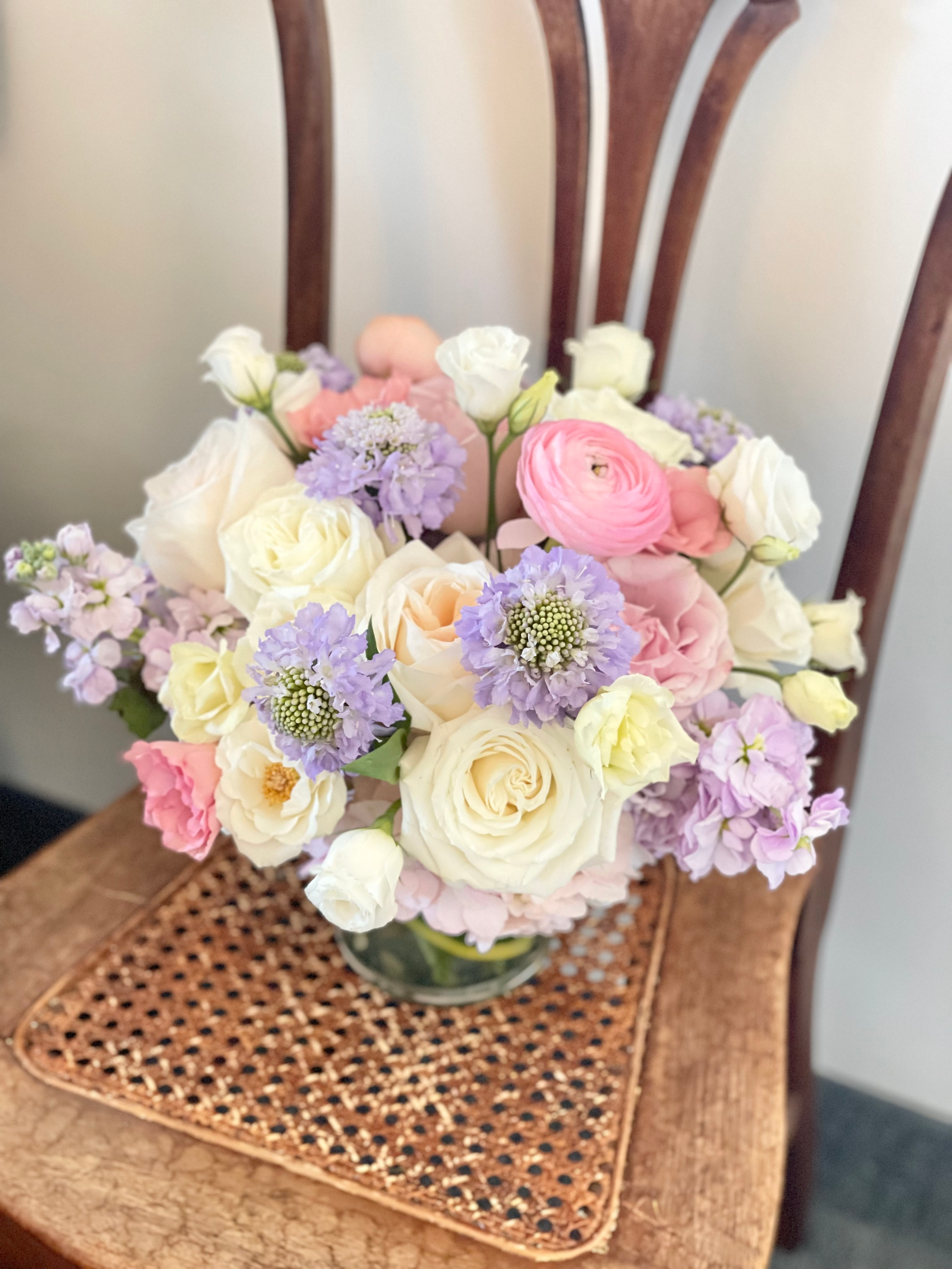 A soft low and lush floral arrangement featuring a combination of fresh pastel blooms, accented with cool greenery.