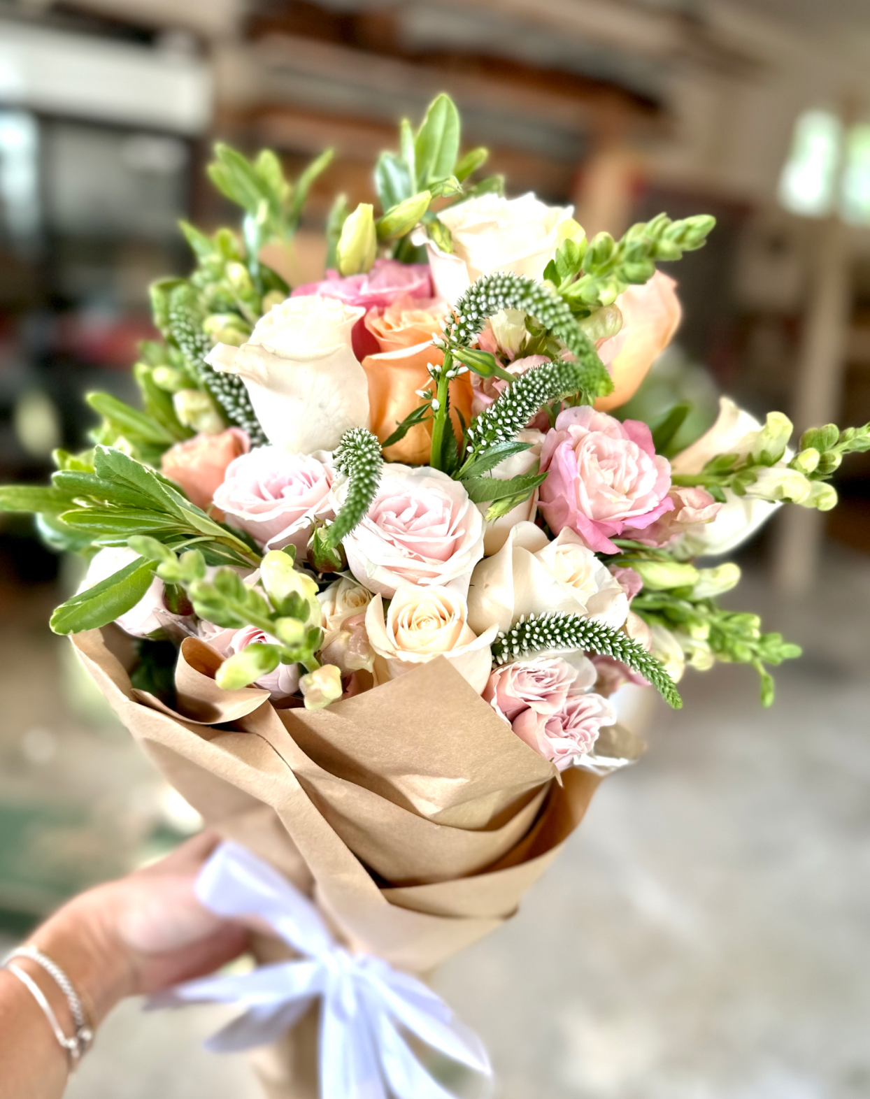 A whimsical and freshly wrapped bundle inspired by National Rosé Day. This bouquet features blush pink and soft ivory blooms.