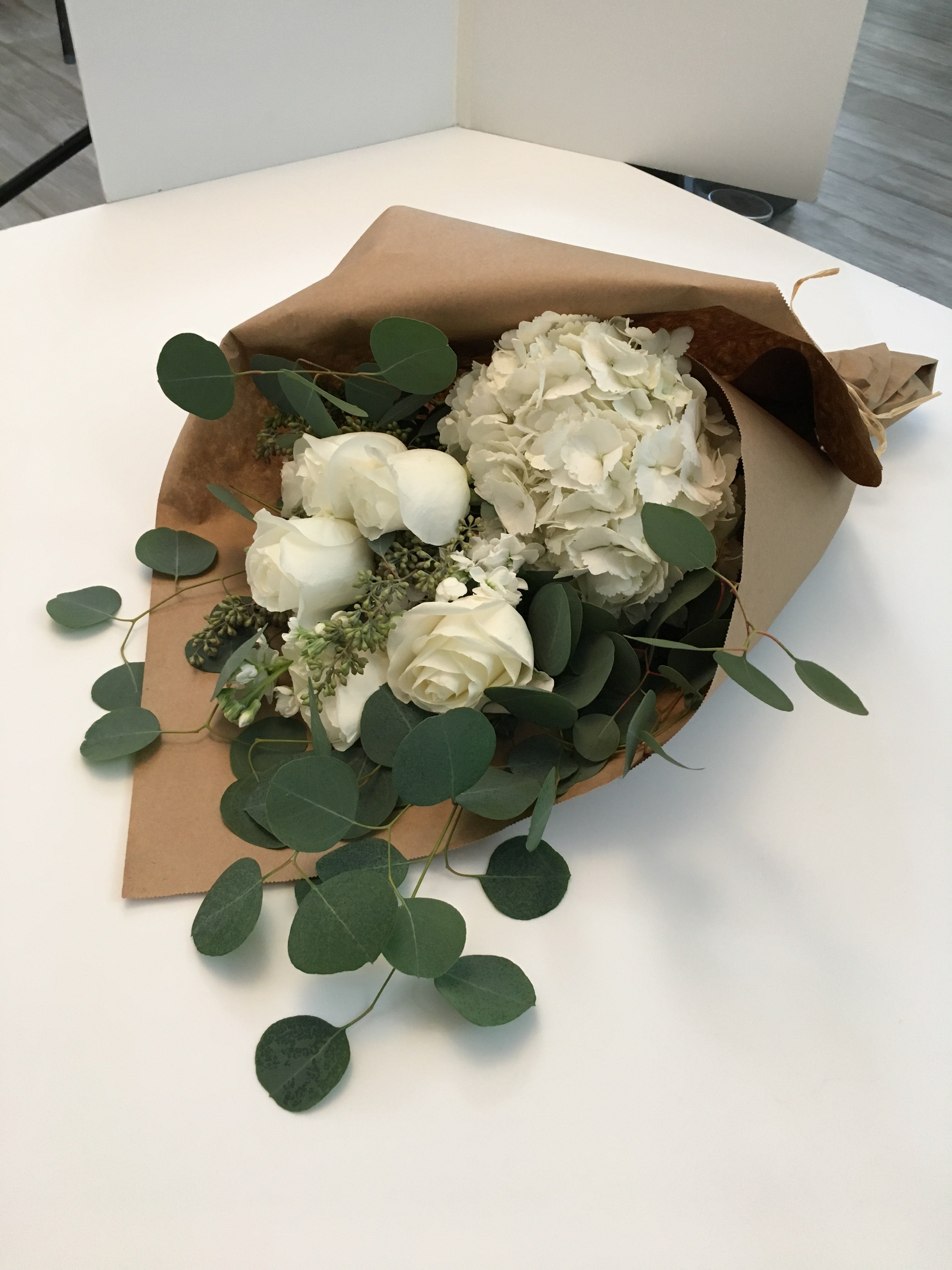 An elegantly wrapped bundle featuring classic white blooms, accented with classic seasonal greenery.