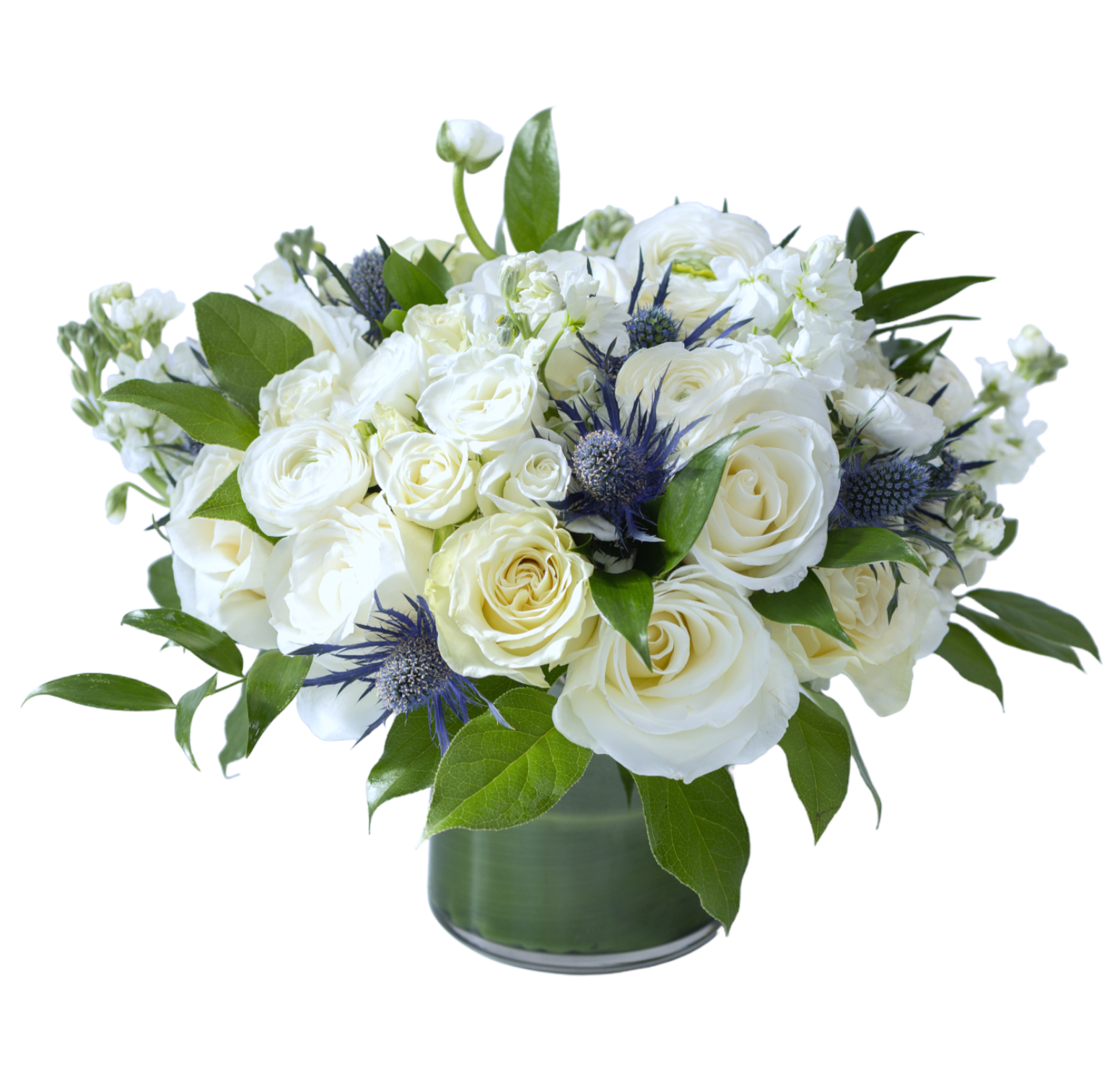 A stunning floral design featuring brilliant white and ivory blooms accented with cool blue tones inspired by April's Birthstone; the Diamond.