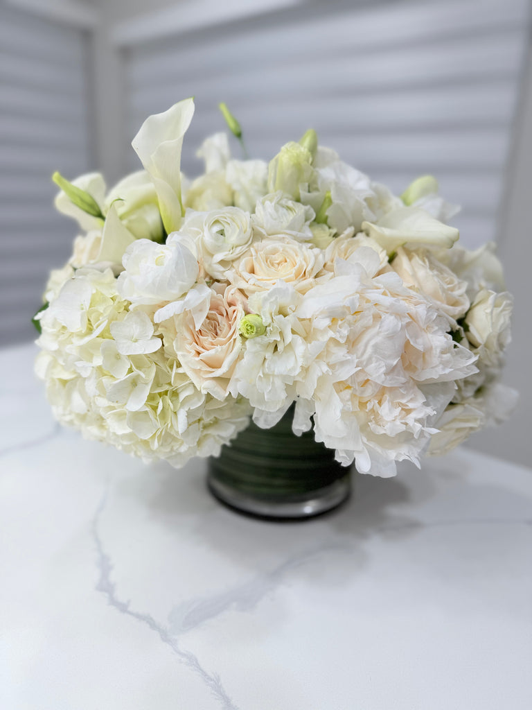 A classic and luxurious Designer's Choice arrangement featuring all white or ivory seasonal blooms in a six inch vase.
