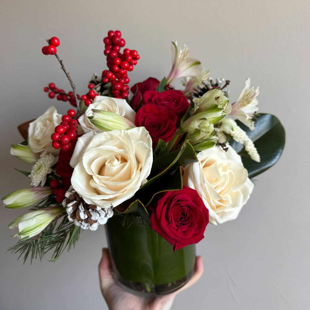 Our traditional holiday designer's choice arrangement featuring red and white seasonal blooms, accented with winter greenery in a four inch glass vase.