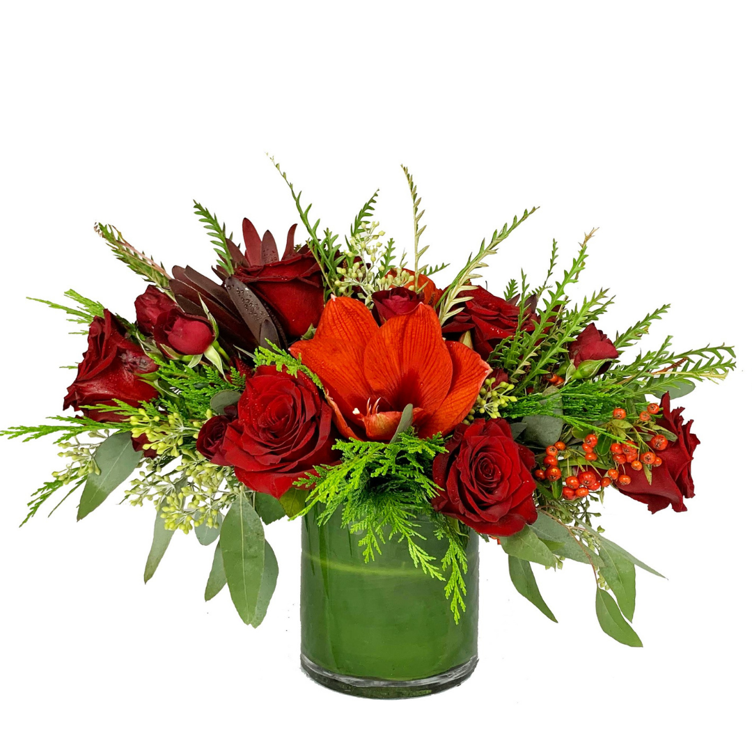 A radiant garden-style design featuring seasonal red blooms, accented with holiday greenery.