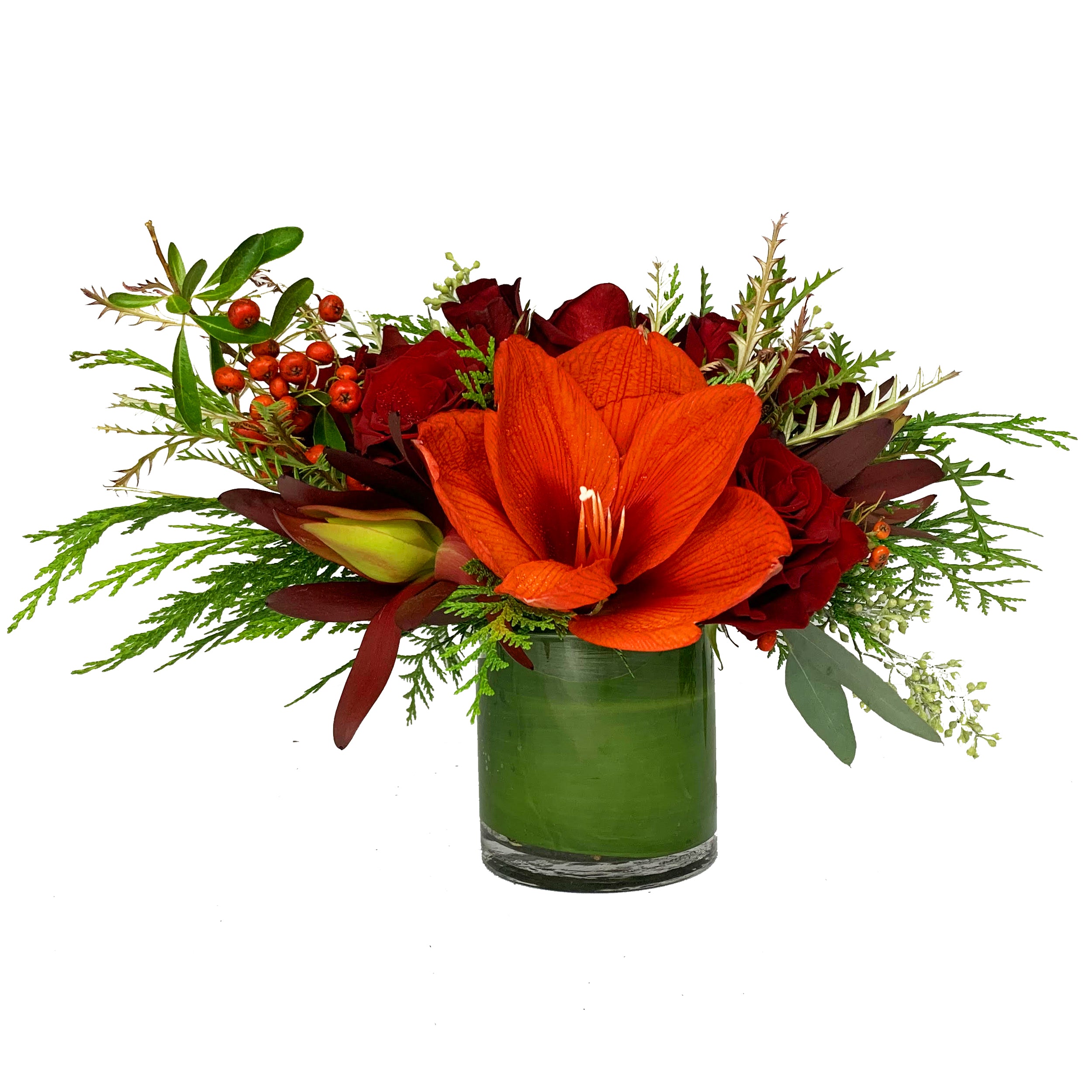 A simple and elegant holiday design featuring bright red blooms, accented with seasonal greenery.