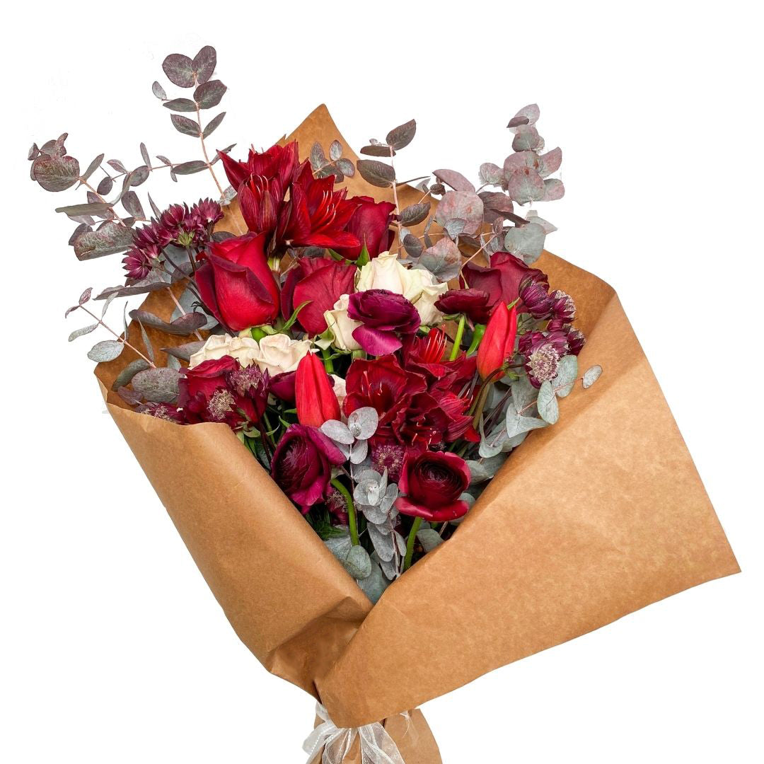 A gorgeous wrapped bundle featuring deep burgundy, bright red, and soft blush blooms inspired by January's Birthstone; the Garnet.
