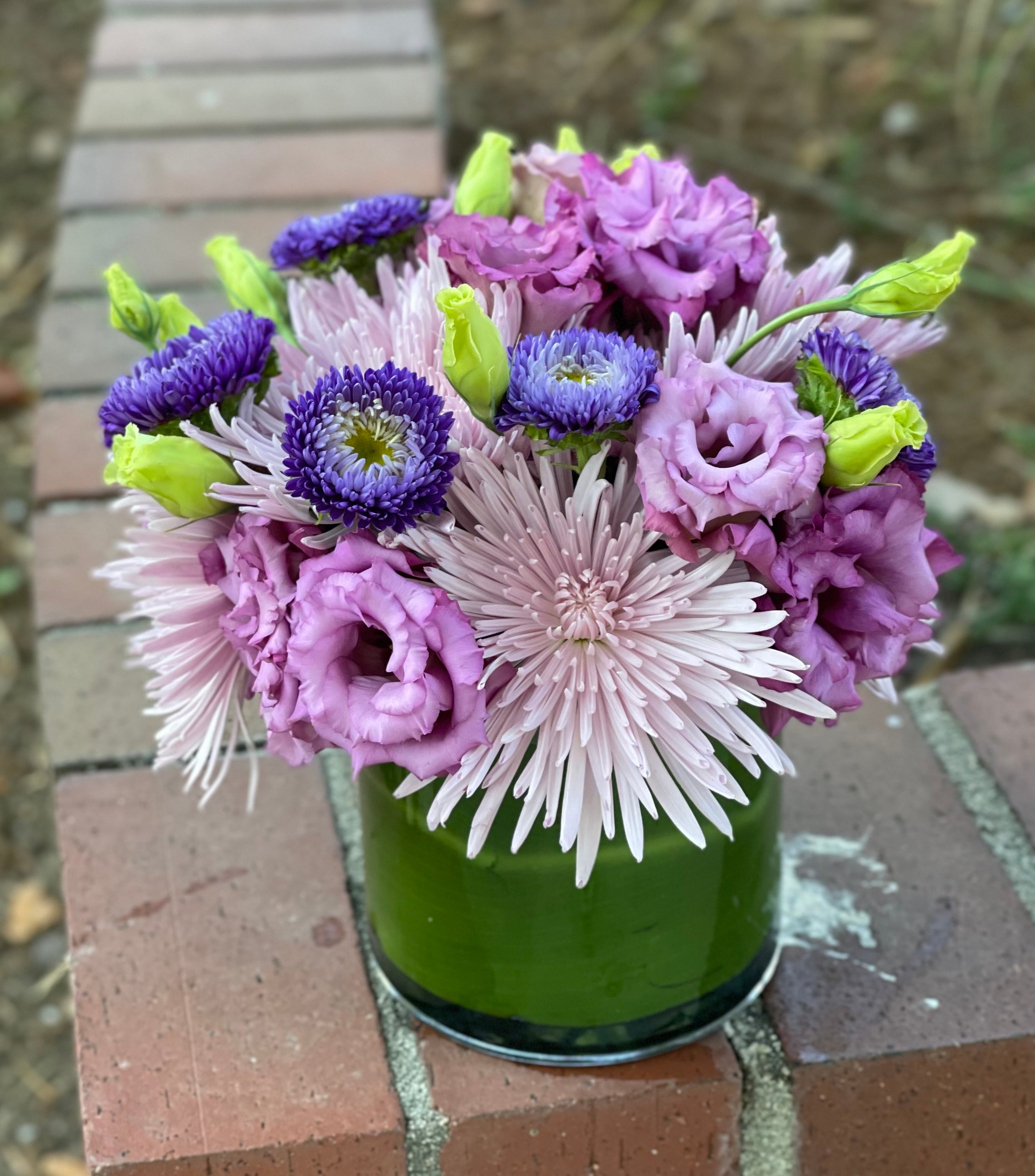 A lovely and compact low and lush arrangement featuring a variety of purple and lavender blooms.