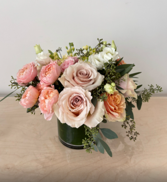 A low and lush garden-style arrangement composed of premium blush and cream roses accented with lavender blooms and whimsical greenery.