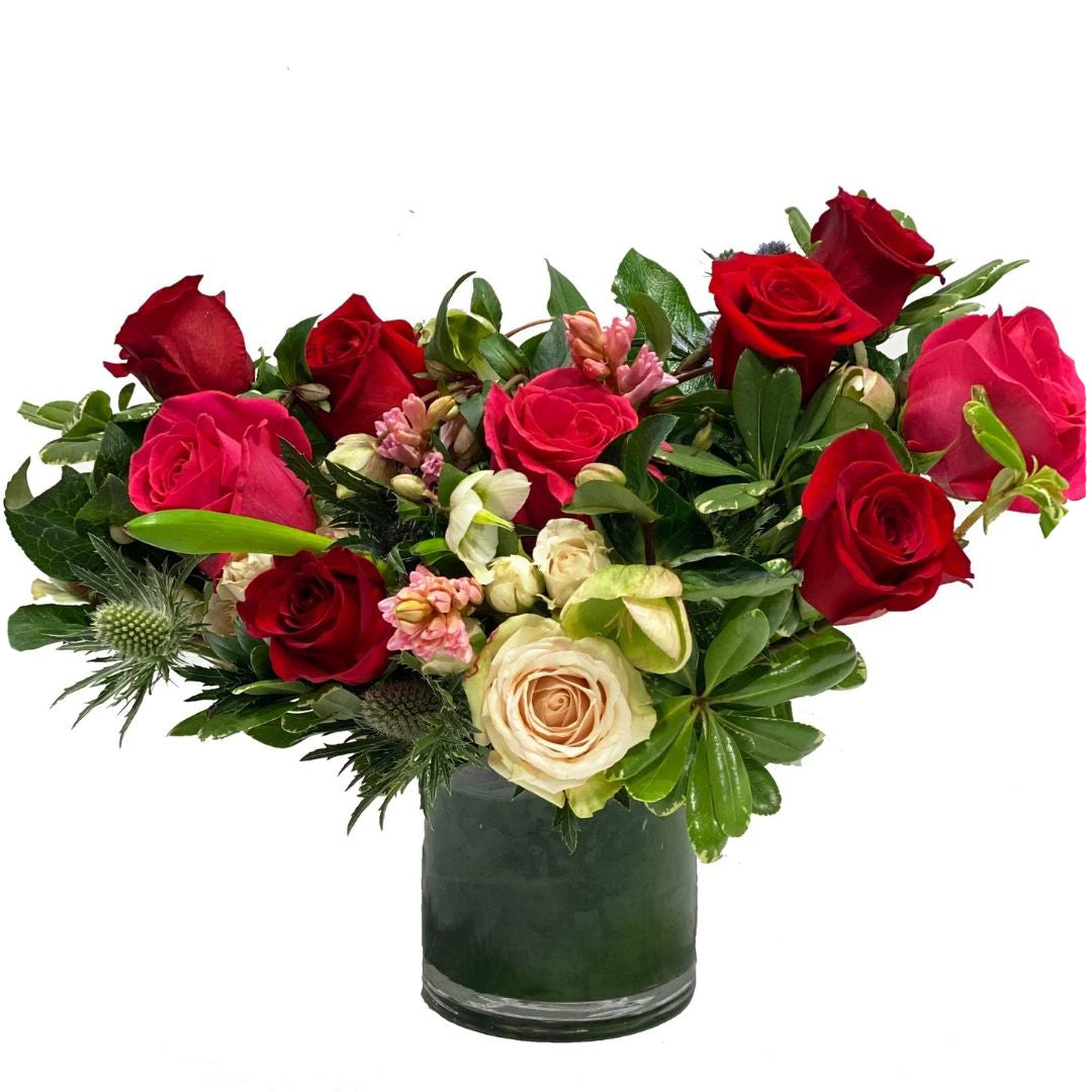 A romantic garden style floral arrangement featuring pink and red blooms, accented with fresh seasonal greenery.