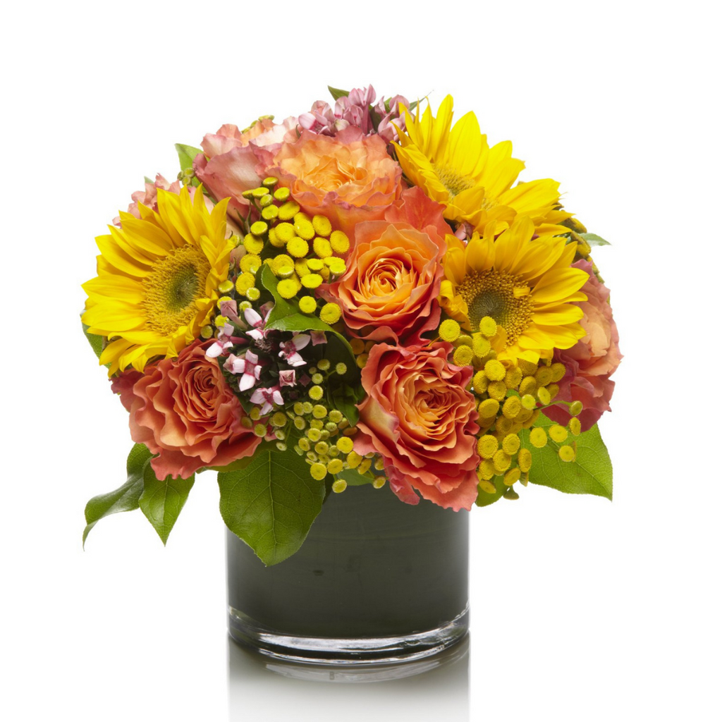 A bright combination of orange and yellow blooms, accented with greenery.