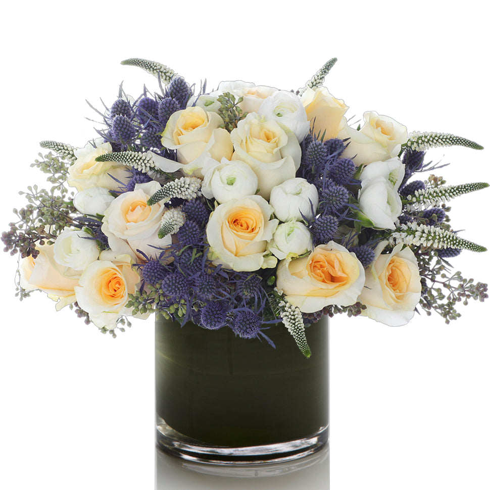 A luxurious cool toned flower arrangement with a combination of white, ivory, and periwinkle blooms, accented seasonal greenery.