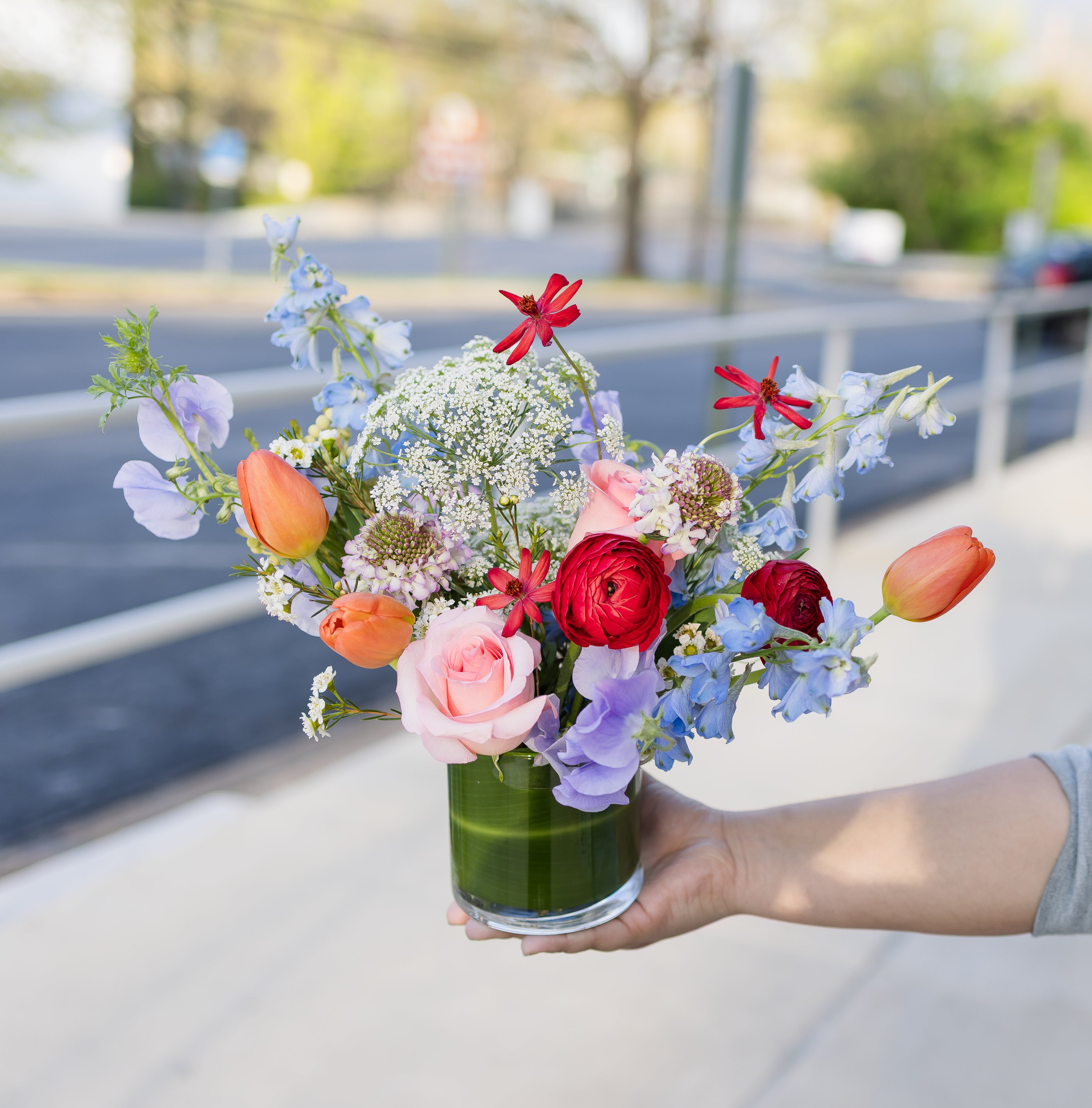 - Roses, ranunculus, delphinium, and tulips may be incorporated into this design pending seasonality, freshness, and availability