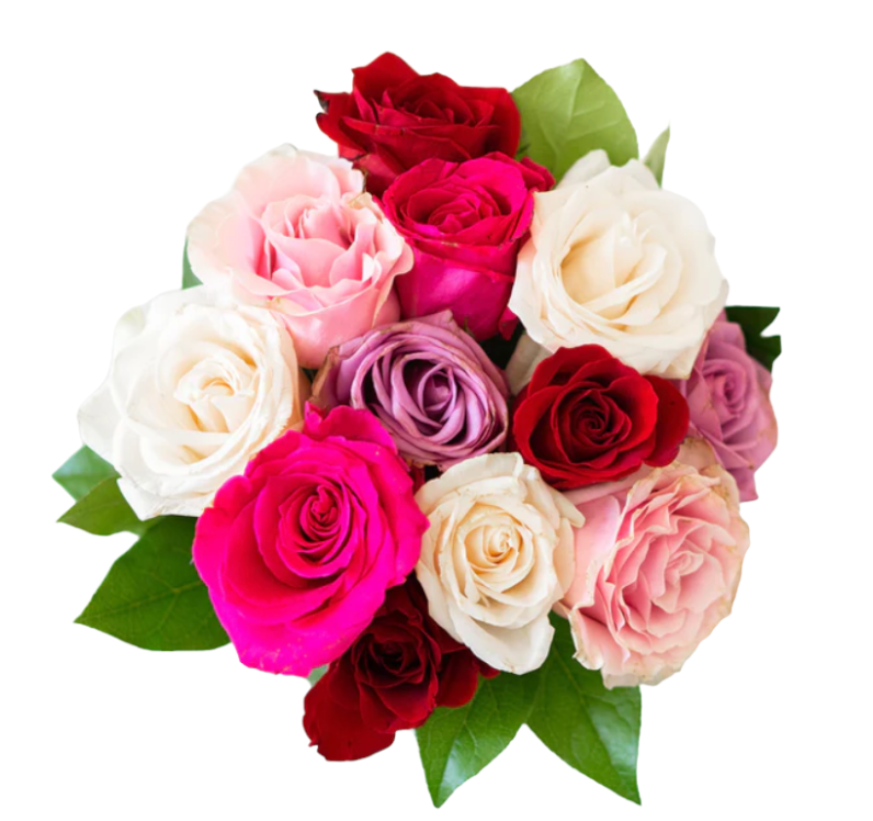 A bundle of 12 roses in lovely shades of pink, red, and white. Delivered directly to your doorstep.