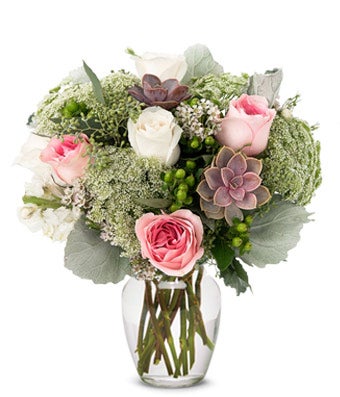 Our sweet and trendy bundle featuring white and light pink roses, succulents, and garden-like greenery; hypericum berries, and queen anne's lace. This bundle is packed for freshness and shipped directly to your doorstep.
